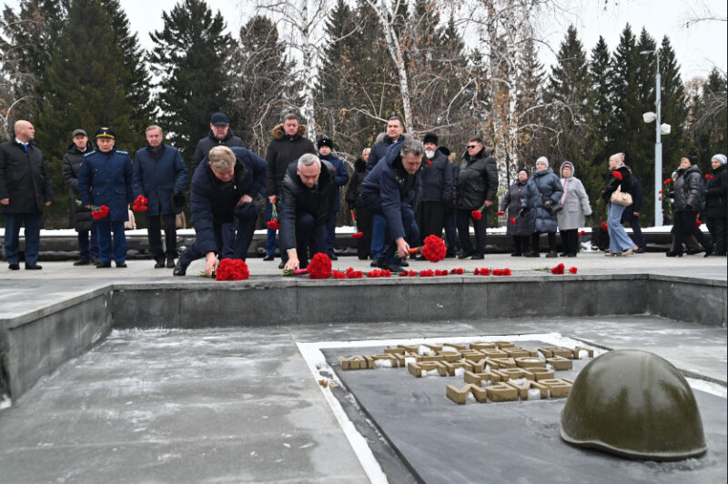 Губернатор Андрей Травников возложил цветы к захоронению праха неизвестного солдата-сибиряка на мемориальном комплексе Монумент Славы.